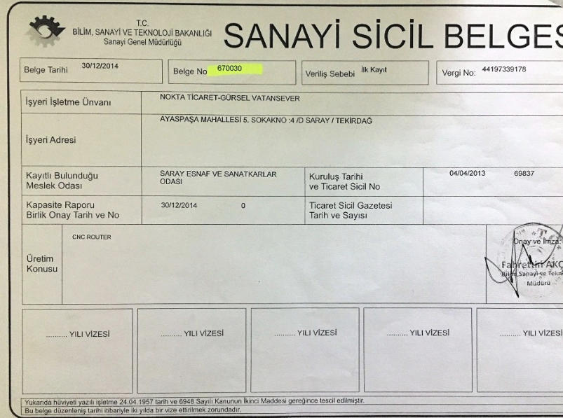 NOKTA CNC SANAYİ BAKANLIĞI KAYITLI BİR ŞİRKET OLUP